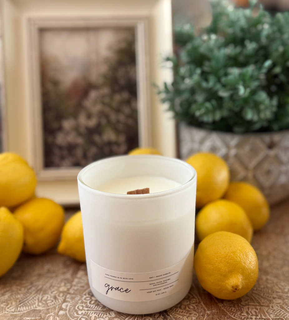 Our Grace Candle provides you with layers of sweetness and subtle herb notes while aiding to eliminate feelings of grief, worry or heaviness. Top notes of lemon and lavender. Middle notes of eucalyptus and verbena with a hint of musk.